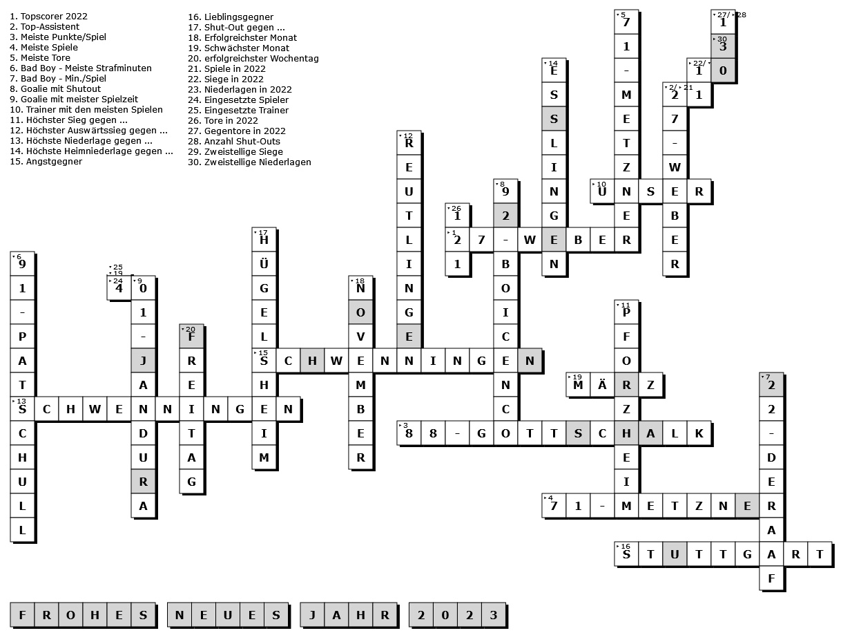Die richtige Lösung unseres Jahresrückblicks-Rätsel ist natürlich das, was die Eisbären ihren Freunden und Fans wünschen: "FROHES NEUES JAHR 2023". Das war wohl nicht so schwer zu erraten, doch die einzelnen Lösungen waren teilweise nicht ganz so offensichtlich, daher findet ihr nachfolgend die Auflösung unserer 30 kleinen Statistik-Rätsel.